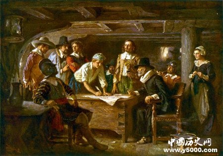1620年9月,102名清教徒在領(lǐng)袖布雷德福的帶領(lǐng)下乘坐著木制帆船“五月花號”駛向自己夢寐以求的美洲。他們冒著生命危險,經(jīng)歷狂風(fēng)巨浪,在茫茫大海上艱難前行。經(jīng)過兩個多月的艱難航行,他們發(fā)現(xiàn)了一塊陸地,便停船靠岸。他們當(dāng)時到達(dá)的地點(diǎn)是今天美國馬薩諸塞州普利茅斯港。