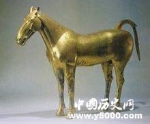 1981年5月,在平陽(yáng)公主墓南邊發(fā)現(xiàn)這一國(guó)寶。高62厘米,長(zhǎng)76厘米,通體銅鑄鎏金,昂首,翹尾,四腿直立,體態(tài)矯健。這匹馬頭部造型十分生動(dòng),粉鼻亮眼,兩耳豎立。史書(shū)記載其為“金馬”,是西漢時(shí)西域大宛國(guó)的汗血馬。這件國(guó)寶,現(xiàn)收藏在茂陵博物館。