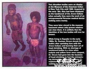 “小人國”在地球上消失了,他們的縮頭術(shù)也就失傳了。這個傳說似乎并不只是個趣聞,關(guān)于“骷髏腰帶”和小矮人的干尸標本都有實物為證。在秘魯國立人類學和考古學博物館的庫房里,就至今保存著幾個被縮小的人頭,只有拳頭般大小,其中一個禿頭,留著絡(luò)腮胡子、面目猙獰,十分詭異。1934 年冬,美國內(nèi)布拉斯加州的兩個無業(yè)游民到落基山脈去采挖金礦,偶然發(fā)現(xiàn)一個約1 米高的洞,洞內(nèi)陰森詭異。他們壯著膽子進入洞內(nèi),發(fā)現(xiàn)了一具高不及膝的小人干尸。他們把這具干尸送往一家醫(yī)院去鑒定,經(jīng)過X 光透視及多項化驗,最后公布的科學鑒定結(jié)果是:此“小人”身高僅48 厘米,皮膚銅黑色,骨骼較人類的骨骼纖細許多;左鎖骨有明顯的致命傷痕;牙齒整齊而鋒利,犬牙尖長,前額很低,而眼睛與面部的比例很不協(xié)調(diào)。從整個體形的發(fā)育程度來判斷,此“小人”是個60 多歲的男性。落基山的這一奇異“干尸”被美國許多報紙作為要聞,在第一版刊登以后,立刻轟動了全國。從那以后,出現(xiàn)了許多與此相類似的消息。很多人爭相報告,自己也發(fā)現(xiàn)過小矮人的干尸,但是因為沒有重視而失落了。只有一個醫(yī)學博士珍藏了自己的發(fā)現(xiàn),但是他拒絕交出。他死后,他的女兒把這具干尸送給美國國家科學院,并妥善保存至今。有人對此提出疑問:這些小矮人的干尸會不會就是病態(tài)的侏儒呢?還有,正常人死亡以后被做成木乃伊標本,身體比例可能縮小,這些小矮人干尸有沒有可能是正常人的身體被藥物侵蝕縮小的呢?只憑一個傳聞和幾具干尸證明有“小人國”的存在,結(jié)論是不是太過武斷?
