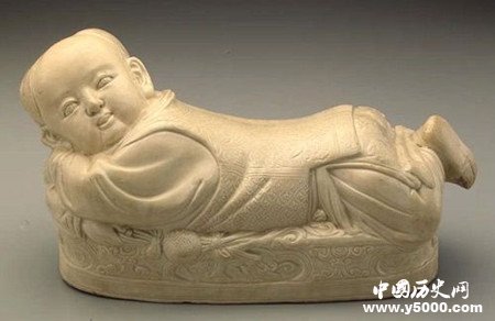 瓷枕造形采嬰兒側臥于榻上,頭微揚、寬額、身碩、雙手交叉為枕,兩腳彎曲交迭,狀極悠閑。左手執(zhí)一狀似彩球童玩,絲帶貫穿,上下以蝴蝶結飾固定。嬰兒臉部交待清晰寫實,模樣雅稚可人,衣飾以今日用語應是:身著長袍,外加背心,長褲,布鞋。背心前襟飾錢形紋,后背劃牡丹,長袍下裳印圓形團花,衣袖長褲無紋飾,顯示以不同布料縫制而成。榻周開光,印有龍紋,底平無釉,刻乾隆御制詩。