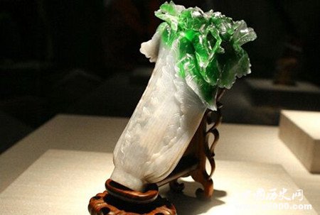 翠玉白菜為與真實白菜相似度幾乎為百分之百的作品,是由翠玉所琢碾而成,親切的題材、潔白的菜身與翠綠的葉子,都讓人感覺十分熟悉而親近,別忘了看看菜葉上停留的兩只昆蟲,它們可是寓意多子多孫的螽斯和蝗蟲。此件作品原置于紫禁城的永和宮,永和宮為光緒皇帝妃子瑾妃的寢宮。翠玉白菜、東坡肉形石、毛公鼎并稱臺北故宮的鎮(zhèn)館三寶。
