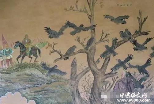 他把腦袋插一個小洞口,頭朝下躺在山坡上。恰在此時,飛來一大群烏鴉,落滿了這個小山坡,呱呱地叫個不停,特別是落在努爾哈赤身上的那些烏鴉爭著啄食他身上的肉,還不停地往身上拉屎撒尿。