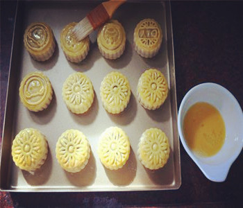 關(guān)于烤制:先烤一次定型,刷上蛋液增色,再度烤至上色即可;刷蛋液的時(shí)候要注意,只要刷表層花紋凸起處且薄薄一層即可,刷太多蛋液會使花紋模糊不清。關(guān)于回油:剛烤好的月餅表皮是干硬無油的,需要放入密封盒內(nèi)3天左右才會變色柔軟和富有光澤。