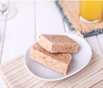首先準(zhǔn)備壓縮餅干配料:膨化粉5公斤白糖1公斤、花生油1公斤、食鹽50克、芝麻250克、水530克。配料前先測(cè)試膨化粉的含水量,以便掌握水量,然后進(jìn)行調(diào)粉。先加油,調(diào)勻后,再加水,攪拌均勻。調(diào)粉時(shí)溫度不能太低,否則易結(jié)塊。粉溫最好在145~145℃為宜。粉調(diào)好后進(jìn)行壓模,模的規(guī)格為4×8厘米,高7.5厘米,壓力90公斤/厘米2,每塊重62.5克,每?jī)蓧K裝一包,標(biāo)準(zhǔn)重125克。成品含水量不超過(guò)6%。而其中要特別注意的是:膨化粉顆粒不能太細(xì),如果太細(xì),溫度太低,調(diào)粉時(shí)易于結(jié)塊。各種糧食膨化粉的體積不同,壓制時(shí)壓力也應(yīng)不同。其壓力大小應(yīng)該是使產(chǎn)品的體積和重量不變。用油的品種也應(yīng)有所選擇,以便更好地貯存。