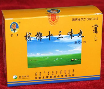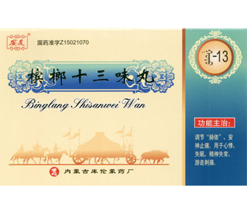 檳榔十三味丸是用檳榔、沉香、肉豆蔻、丁香、木香、廣棗、制草烏、干姜、蓽茇、胡椒、紫硇砂、當(dāng)歸、葶藶子等十幾種原材料制作而成的一種中成藥,是一種棕褐色的小水丸,氣味芳香,味道辛而微咸。檳榔十三味丸具有清熱瀉火,豁痰開竅,養(yǎng)血安神,調(diào)理臟器間相互平衡協(xié)作功能。服用方便,見效快,治愈率高,是目前針對(duì)抑郁癥、強(qiáng)迫癥、精神分裂癥、更年期綜合癥、神經(jīng)衰弱、癔病的特效蒙藥。