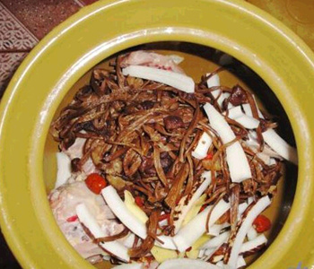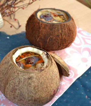 制法:雞洗凈斬件,燒熱鑊放油爆炒,然后與斬件椰子一同放入鍋內(nèi),注入清水。煲滾后文火煲一小時(shí),加入適量鹽調(diào)味即可。