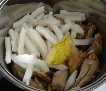3、另用瓦煲煮滾一煲水,放椰子肉,枸杞,紅棗,黨參,生姜,待水滾后,將雞肉放入煲內(nèi)。