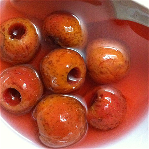 4、用果核和浸泡過山楂的水熬煮山楂,可以使湯汁顏色更好看,味道更濃郁。
