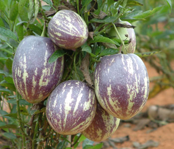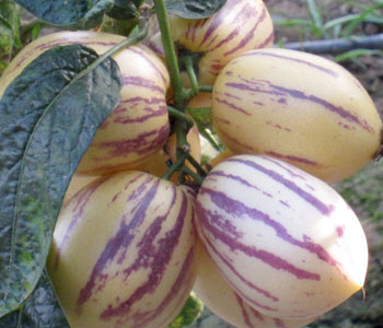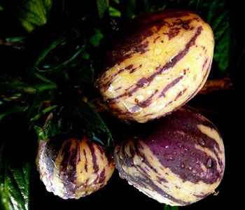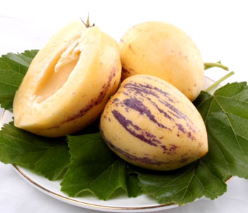 我國廣泛種植的人參果,是引自南美洲的茄科植物,原名茄瓜,形狀為心臟形和橢圓形,成熟時果皮呈金黃色,有的帶有紫色條紋,有淡雅的清香,吃起來爽甜多汁。