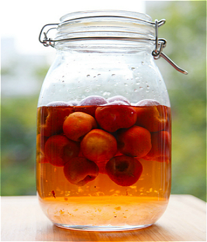 2、處理好的山楂和冰糖一同放入無(wú)水無(wú)油的干凈玻璃密封罐,倒入酒。不要用塑料。實(shí)在沒(méi)有密封的也行,把瓶蓋蓋好就行。