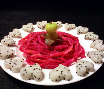 火龍果果皮中色素即為甜菜紅素,紅肉種果實果肉中所含色素也是甜菜紅素。它具有抗氧化、抗自由基、抗衰老的作用,還能提高對腦細胞變性的預(yù)防,抑制癡呆癥的發(fā)生火龍果皮最好的吃法就是榨成汁加點砂糖,凍到冰柜里口渴的時候拿來飲用,清甜可口,消暑解渴,除了含有豐富的碳水化合物、蛋白質(zhì)及花青素外,還含有濃度很高的維生素A、B1、B2、B3、C及鈣、磷、鐵等礦物質(zhì),為最佳的天然維生素來源。有明目、降火及良好的養(yǎng)顏美容效果。是暑熱天生津解渴的最佳水果?;瘕埞?jīng)冷藏后口感更清脆香甜,且可久藏。