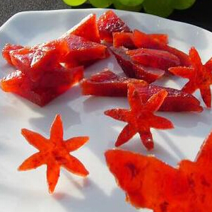 選擇新鮮無蟲害的大個山楂果實,剔除雜質用水洗凈陰干,放入煮鍋內加水煮沸至山楂崩裂撈出,用鋼絲篩濾出果肉。按1kg果肉:1kg白糖加入少量藕粉攪拌放到合適容器內凝結即為成品。根據(jù)需要切成條狀或塊狀,即可食用。