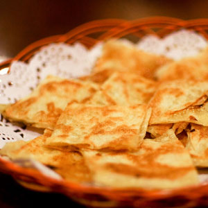 注意:面團(tuán)不要太硬。僅僅用榴蓮的水份和面,所以面粉要分次加入,一次加得太多,和出的面團(tuán)太硬 ,烙出的餅口感就不夠好。所以面粉適量,是由榴蓮中水份的多少決定的。