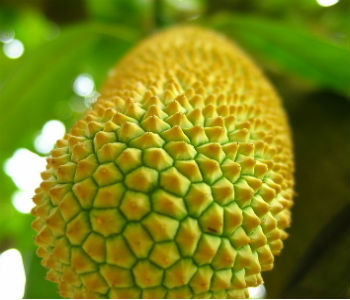 5、另外提供一個(gè)簡易吃法:取螺絲起子在榴蓮尾端插入后上下左右搖擺,果實(shí)產(chǎn)生裂縫時(shí),即可剝開享用。榴蓮屬有后熟度的水果,須等8分熟時(shí)才可摘采待其自然熟透,若表皮為青色則代表成熟度不足即采收,會(huì)影響風(fēng)味。