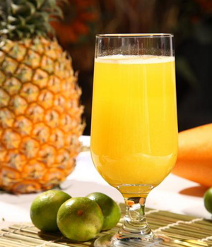 2、菠蘿、白蘿卜洗凈去皮切片后,連同金桔用分離式榨汁機(jī)榨出原汁即可飲用。