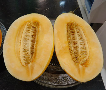 2、哈密瓜洗凈,去皮去籽切片待用。