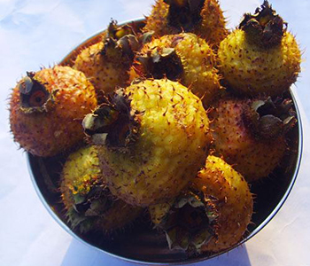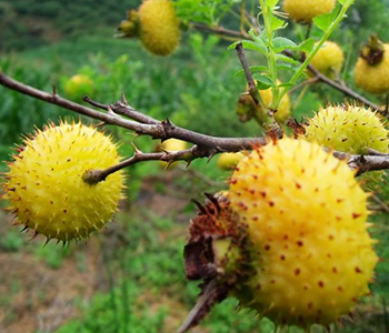 刺梨子的果實是扁扁的球形,8、9月份成熟,果實是黃色的,有時又帶一些紅暈的,而且果皮上長著不少小肉刺,“刺梨”這個名字就是這么得來的。