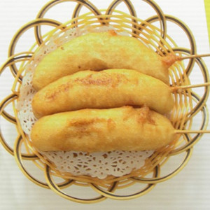 8、切好的香蕉段,均勻的蘸上脆皮糊,一個一個地下入油鍋,并撈起。