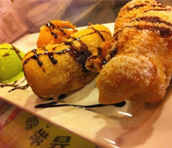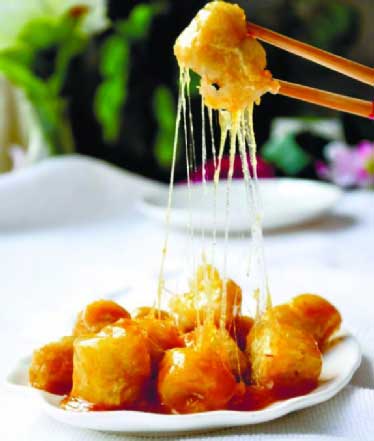 拔絲香蕉是以香蕉、糖、雞蛋為主要食材的漢族傳統(tǒng)名菜,屬魯菜系。菜品外脆里嫩,甜糯可口。色澤淺黃微亮,質(zhì)地柔軟鮮嫩,吃時蘸水拔絲,香甜可口沁心。山東是拔絲菜的發(fā)祥地,著名菜肴還有拔絲蘋果、拔絲山藥、拔絲紅薯、拔絲金棗、拔絲櫻桃、拔絲香蕉等。