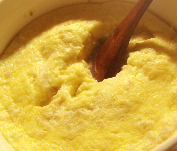 4、再將剩下的半根香蕉放到另一個容器中全部碾碎,接著加入牛奶淹沒香蕉泥,然后再攪拌混合均勻。