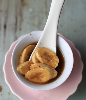 3、把水果醋和紅糖攪勻,然后放入切好的香蕉片。