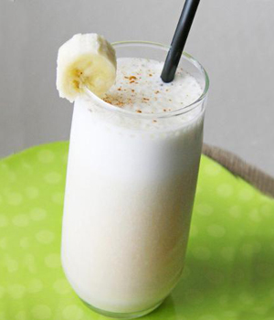材料:1熟透的香蕉、1湯匙糖、2/3杯冷牛奶、幾粒鹽