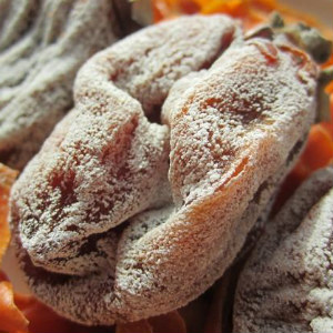新鮮的柿子里含有大量水分,還含有葡萄糖和果糖等。當(dāng)它被曬成干柿子餅時,水分逐漸蒸發(fā),果肉里所含的葡萄糖和果糖隨之滲透到表皮上來。
