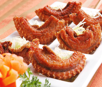 注意:汆炸大王蛇段時,要掌握好火候、油溫,切不要炸焦、烤煳。