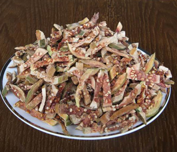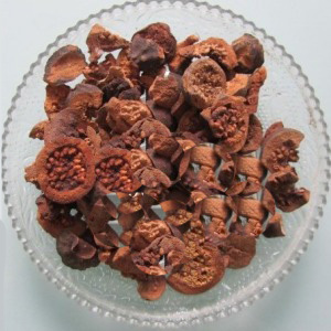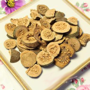將野生番石榴未成熟的幼果進(jìn)行干燥處理,然后切成片。鮮時(shí)為青綠色,干者呈現(xiàn)黑褐色;表面稍粗糙堅(jiān)硬,頂端有宿存的花萼及殘存花柱。果肉堅(jiān)硬,淺棕色,5室,有多數(shù)種子密集鑲嵌于內(nèi);種子灰褐色,大如綠豆,呈不規(guī)則之扁圓形或三角形,味微酸而澀,氣微香,以飽滿、堅(jiān)實(shí)者為佳。