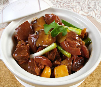 2.炒鍋置旺火上,放入熟油50g,燒至八成熱時(shí)人狗肉爆出香味,噴紹酒,加入醬油、精鹽和原湯,燒開后倒在砂鍋內(nèi),用小火煨至酥爛,收干汁,盛人盤內(nèi)。