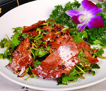 1、熟狗肉切片,裝在小盤備用。