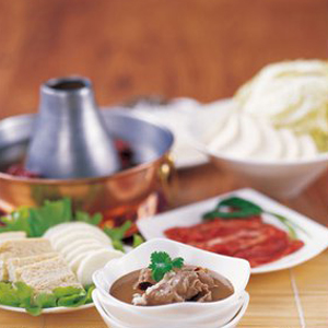 主料:羊肉500克、鮮魚1條、菊花30克、白菜400克、油麥菜300克、豆腐200克、香菇150克、藕100克