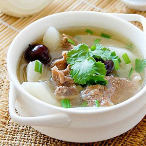 制作:羊肉500克切塊,蘿卜500克切塊,草果兩個(gè)(去皮),甘草3克,生姜5片,同放鍋內(nèi)煮湯,湯煲好后加少量食鹽調(diào)味食用。