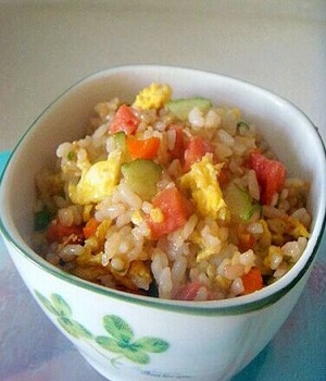 火腿200g,米飯400g,雞蛋2個(gè),胡蘿卜50g,黃瓜30,蔥花10g,油15ml,醬油5g,鹽5g
