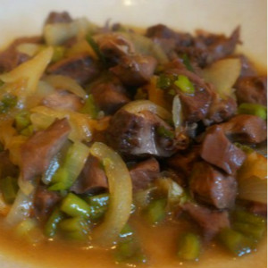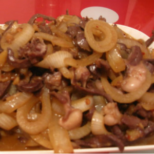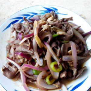 原料:豬心、洋蔥、姜絲、油、鹽、十三香、芝麻油、生抽、白糖、酒。
