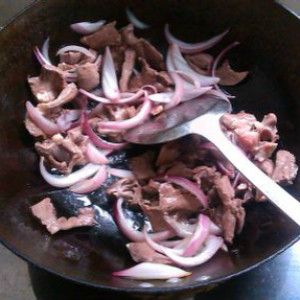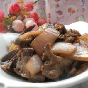 6、鍋中再次放油,油熱后放入洋蔥煸炒2分鐘后放入豬心一起翻炒。