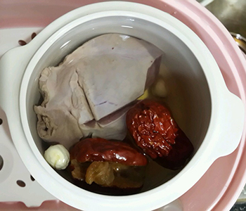 3、把準(zhǔn)備好的紅棗和豬心一起放入砂鍋中,加入適量清水,調(diào)至自動(dòng)檔煲至豬心熟爛即可食用。