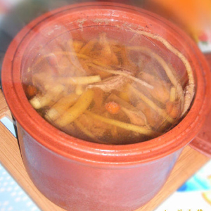 2、將黨參、當(dāng)歸和豬心放入沙鍋內(nèi),然后加入適量的清水,用文火燉至豬心熟肉變爛;