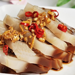 制作要領(lǐng):水最好一次加足,如覺得燉好的湯汁不夠黏稠,可再繼續(xù)開火再熬一熬。煮的時(shí)候不加生抽便是白色有些透明的凍。也可不放蔬菜丁,那可是純粹的豬蹄凍!