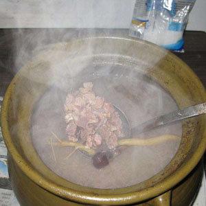 2、將用料一齊放入砂煲里,加開水適量,用文火煲2小時(shí),調(diào)味食用。
