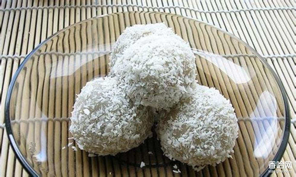糯米1000克、椰子2個、生粉1000克、白糖300克、煉奶250克、精鹽5克、板蘭葉數(shù)片,生油適量。
