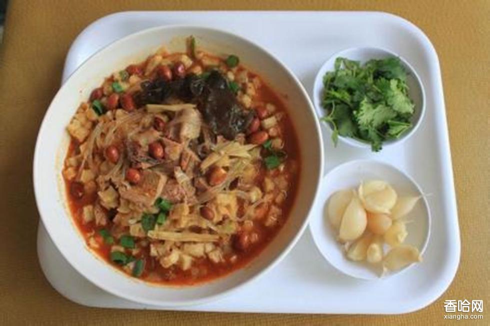 原料:面粉、堿、羊肉、豆腐、干辣椒、蔥、蒜、蒜苗、精鹽、味精、蔥姜水、花椒水、醋、醬油、植物油。