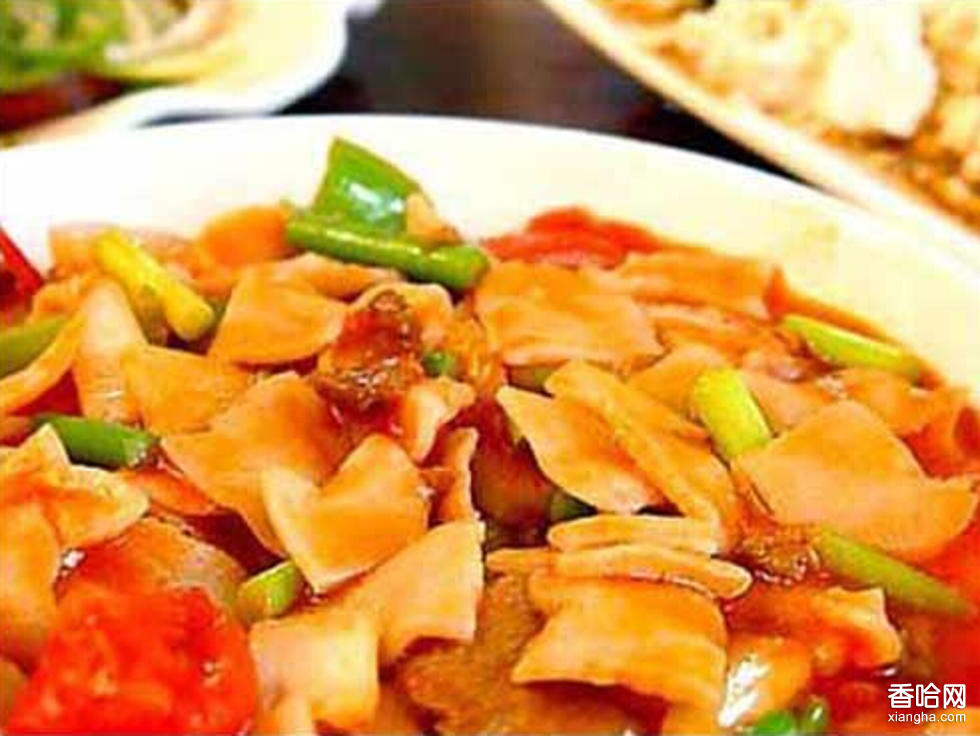 把優(yōu)質(zhì)面粉揉成面團放在案上餳好。羊肉切成片,油鍋燒熱,放入肉片、蔥丁、姜、蒜煸炒,加入醬油、鹽、花椒水,上火煮。把餳好的面團壓薄,待水開后將面團揪成小片投入,熟后撈入炒肉鍋,翻炒入味,加入鮮湯、時令鮮菜和辣椒油。這道菜面韌肉鮮,口味獨特。