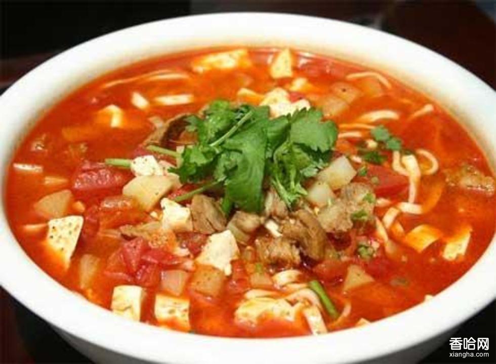 先將面粉揉成面團醒好,將羊肉切成大丁炒熟。然后將面搓成筷子般粗,下鍋煮熟,再澆上用羊肉原汁、羊肉丁和新鮮蔬菜燴成的湯,放入辣椒紅油即口可食用,面精肉鮮,風味獨特。