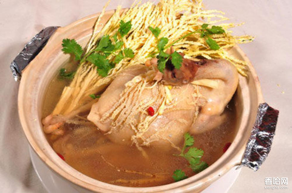 2、改用慢火浸煮(以湯中冒氣眼而不滾開(kāi)為度)約5分鐘,用鐵勾將雞提 起,倒出腹腔湯水,再放入湯中浸煮,反復(fù)三、四次、至僅熟(不可大生也不可 過(guò)熟),離火后另放涼湯中浸泡稍為冷卻后取出,抹上一層香麻油,使皮色淡黃 光亮,食時(shí)斬件裝盤(pán),砌成原雞形上席。