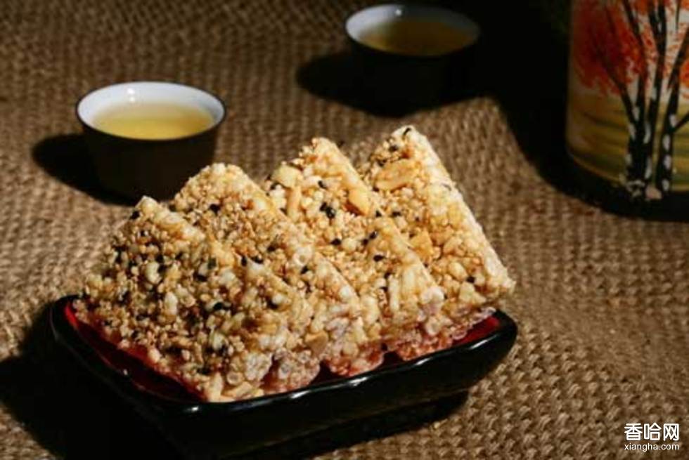 米花糖是三亞人喜愛(ài)的風(fēng)味小吃之一。其制作是采用糯米、粳米各半洗凈后,用粗沙滲入鐵鍋中炒熱開(kāi)出米花;然后用較濃的紅糖水拌均,放在四邊圍小板的大塊長(zhǎng)形木板上壓實(shí),再加上紅濃糖汁鋪面,待涼干后即可切塊食用;還可用于開(kāi)水沖,待冷卻后,食用起來(lái)又是一番別致的風(fēng)味。