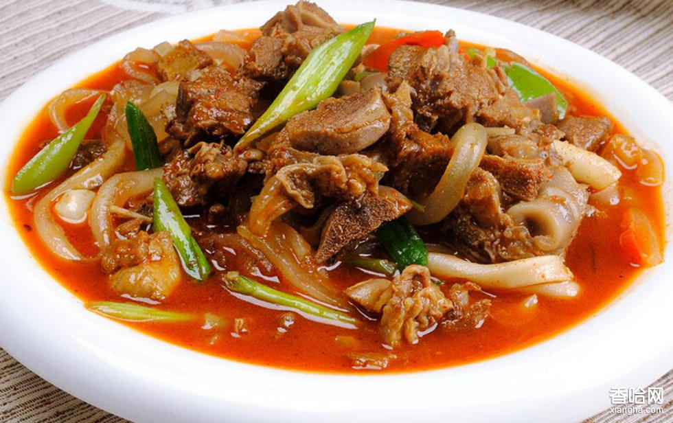 先將面粉揉成面團(tuán)醒好,將羊肉切成大丁炒熟。然后將面搓成筷子般粗,下鍋煮熟,再澆上用羊肉原汁、羊肉丁和新鮮蔬菜燴成的湯,放入辣椒紅油即口可食用,面精肉鮮,風(fēng)味獨(dú)特。