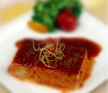 做法:1、大石斑肉切成5厘米見方的片塊加入鵝肝醬腌制10分鐘。