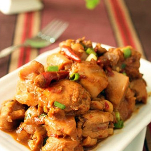 4、鍋中熱油,放入蔥頭絲、干辣椒、香葉、胡蘿卜片、苦瓜絲、胡椒粒煸炒,待煸炒至半熟時,再放入炸好的兔肉片,并加入番茄醬煨熟即可。