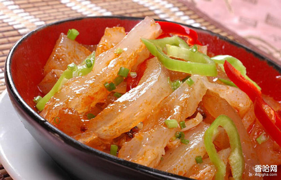 做法:一、將牛蹄筋留皮去毛,燒烤洗凈,刮去焦黑外皮,用堿水略泡,再反復(fù)刮洗,直至堿味消失,露出金黃色停止。然后入鍋加水煮到八成熟,取出,剔去骨骼,再上籠蒸到筋爛皮熟綻。